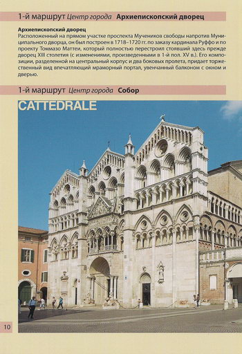 Кафедральный собор (Cattedrale di Ferrara), посвященный Пресвятой Деве и св.Георгию - покровителю города. В фасаде собора сочетаются различные стали: романский (1135 г.), приписываемый архитектору Николаусу, с одним рядом лоджий с тремя вратами и готический, относящийся к середине XII в. и к началу XIV. Фасад состоит из стрельчатых арок с трехстворчатыми окнами в форме розы, и второго ряда легких портиков. Третий ряд образуют лоджии с глубокими проемами, конструкцию завершают три шпиля с круглым резным окном в центре.