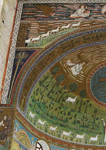 При этом декоративность Равенны тут достигает кульминации. И свежесть трав, деревьев, цветов, и сверкающие драгоценные камни на кресте, и завитки шерсти животных, и складки облачения святого - всё это сделано из кусочков сияющего цветного стекла, смальты, с добавлением золота, серебра, перламутра, полудрагоценных и обычных камней.