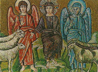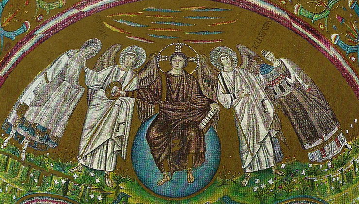 «Христос-Спаситель на престоле с Ангелами», мозаика базилики Сант-Аполлинаре-Нуово (справа).