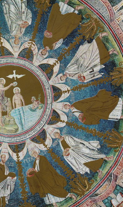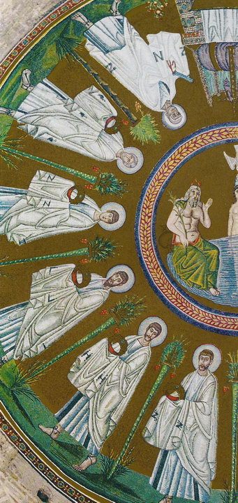 Апостолы на своде Арианской крещальни впервые для равеннских циклов представлены с нимбами. Они разделены стилизованными пальмами и держат в руках венцы Небесной славы, за исключением первоверховных апостолов - св.Петра, с ключами, и св.Павла, со свитком.