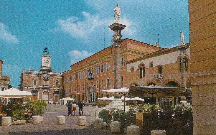 Перед Палаццо дель Комуне - высокие колонны, водруженные тут в 1483 г., в эпоху венецианского правления. Их базы, украшенные знаками зодиака и аллегорическим фигурами, изваял Пьетро Ломбардо. На вершине колонн - статуи Небесных покровителей Равенны: слева, святителя Аполлинария, первого местного епископа, справа, мученика Виталия, поставленного там, где прежде высился крылатый лев св.Марка - венецианский символ, убранный в 1509 г., с окончанием владычества Республики «Серениссима» над этим краем.