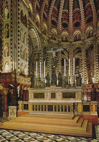 Над алтарем и вокруг него видно тридцать скульптур работы Camillo Boito (1895), которому принадлежит также проект расположения главного алтаря.