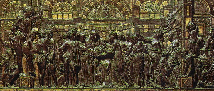 Барельеф «Мёртвый Христос и плачущие ангелы» работы Донателло на главном алтаре собора (справа).