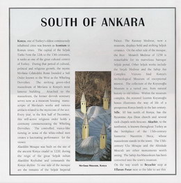 Конья (Konya) • Старые мечети и крутящиеся дервиши Мевляна в Конье • Акшехир (Akşehir) • Бейшехир (Beyşehir) • Чаталхёйюк (Çatalhöyük) • Ивриз (Ivriz) • Эрегли (Ereğli) • Горы Махалач (Mahalaç) • Караман (Karaman) • Маденшехир (Madenşehir) • Дебре (Debre) • Ташкале (Taşkale)Провинции к юго-востоку от Анкары
