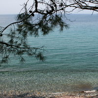 Эгейского моря и греческих островов на горизонте, к второму пляжу Айдынлык. Пляж галечный,