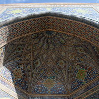 Позолоченное медресе • Здание медресе Тилля-Кари • Входной портал-пештак мердресе Тилля-Кари • Главные ворота и минареты • Украшения и декор медресе Тилля-Кари • Майолика, изразцы и мозаика в декоре медресе Тилля-КариВнутренний двор медресе Тилля-Кари (Tillа Qоri Mаdrаsаsi) на площади Регистан в Самарканде